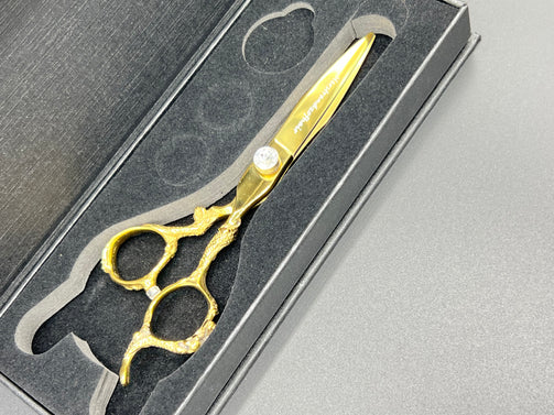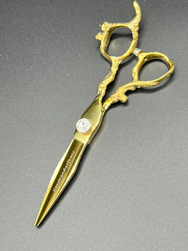 Right Handed 6 inch China Steel Shear. Gold color shears with crystal rhinestone tone. Adjustable crystal rhinestone screw to tighten or loosen shears for the right tension, to help ensure smooth movement and precise cutting.