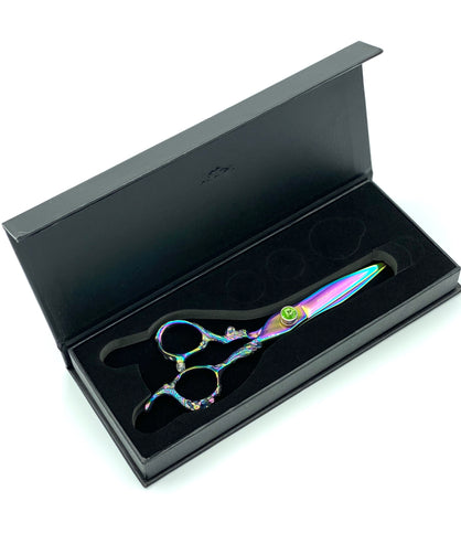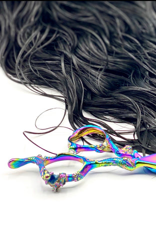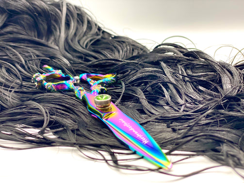 Right Handed 6 inch China Steel Shear. Pinkish Purple color tones with a hint of green color wave. Adjustable green rhinestone screw to tighten or loosen shears for the right tension, to help ensure smooth movement and precise cutting.