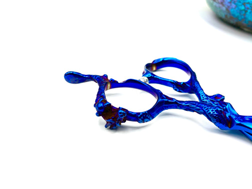 Right Handed 6 inch China Steel Shear. Greenish blue color tones with a hint of purple. Adjustable orange rhinestone screw to tighten or loosen shears for the right tension, to help ensure smooth movement and precise cutting.